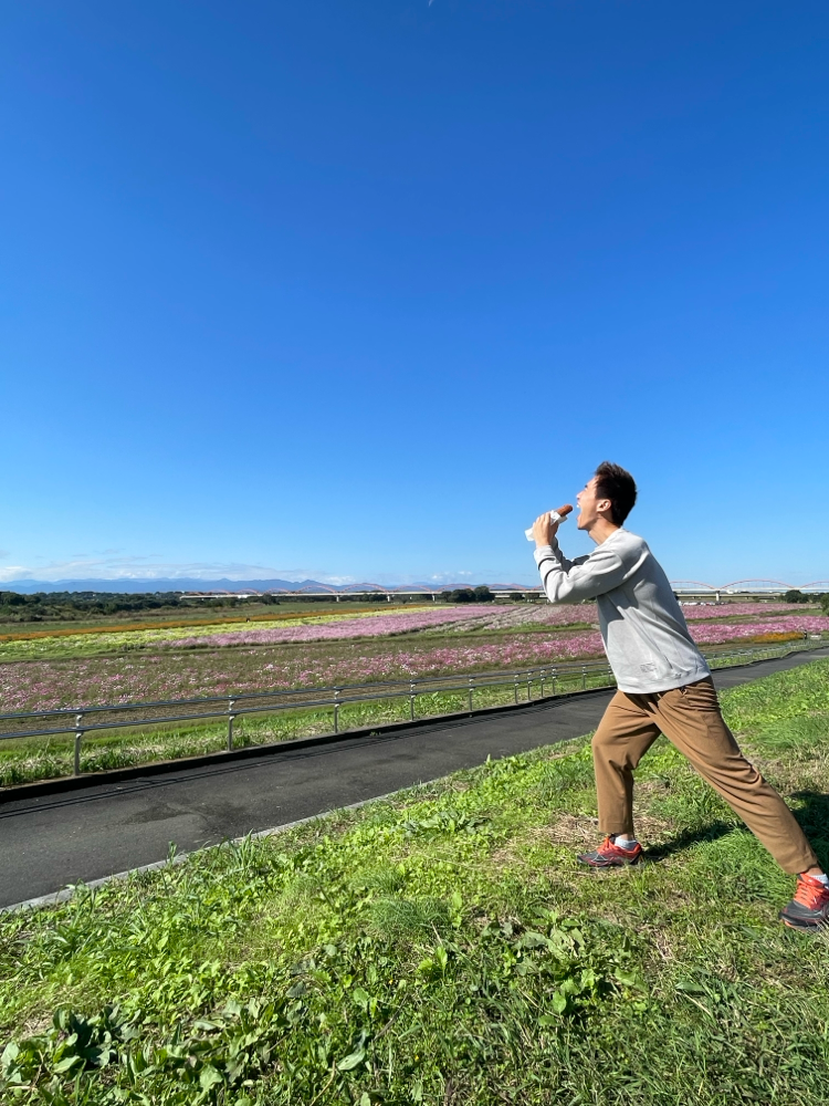 コスモス畑を眺めながらカレーパン🥖食べてるのも